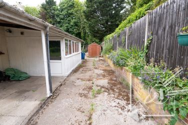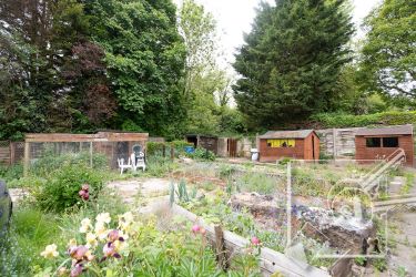 A large plot laid to lawn with various sheds perfect for storage. To the side of the property is a spacious patio with a small pond, and flower beds. Mature shrubs, trees and hedges line the borders of the property for extra privacy.