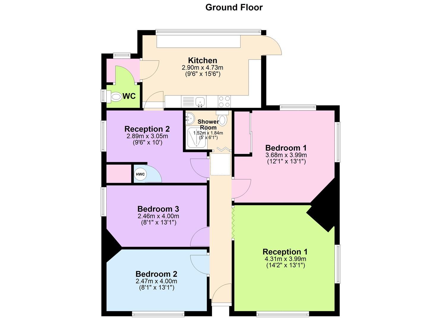 A comfortable space benefitting double aspect double glazed windows. Carpeted floors. Boarded fireplace in corner of room. Two radiators.